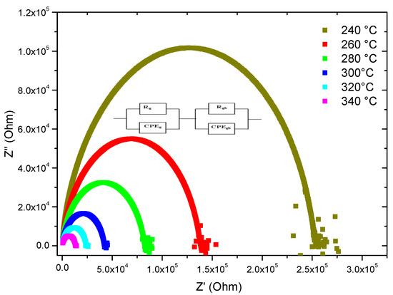 The parameters of the equivalent circuit model are obtained based on the complex impedance Z* formula for sample TZV5 at different temperatures (see Figure 7).