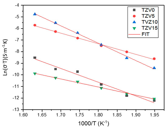 Ea could be calculated using the fitted curves σDCT against reciprocal temperature (1000/T) as listed in Table 2 and compared to other glasses [18,24,25]. The highest and the lowest values of Ea were founded for the TZV10 and TZV15 glasses, correspondingly.