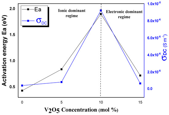 The curves describing the variations of Ea and σDC (at 300 °C) with V2O5 content show a competition between two conduction mechanisms (see Figure 9).