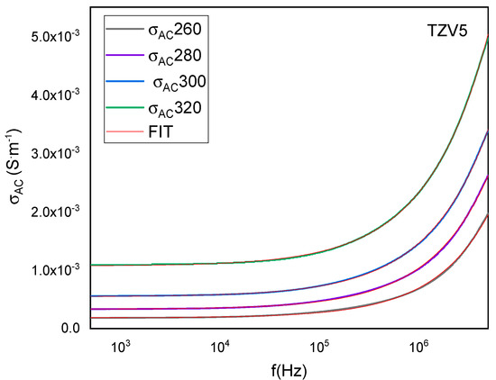 A good agreement between the experimental and theoretical values is obtained for TZV5 at 280 °C (see Figure 6). This demonstrates the suitability of the equivalent circuit in well-describing the electrical properties of the glasses. The resulting parameters A and n indicate a non-ideal Debye-like behavior since the arc plot (Z′′ vs. Z′) is depressed for all the V2O5 content, and its center is below the real axis [20,21]. We attribute the deviation from the Debye profile to the formation of macroscopic dipole groups and/or nonpolar clusters [22].