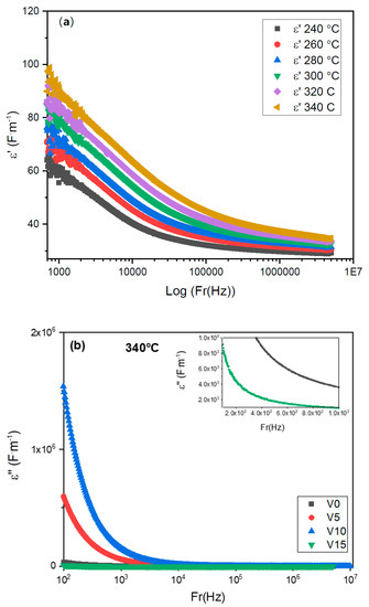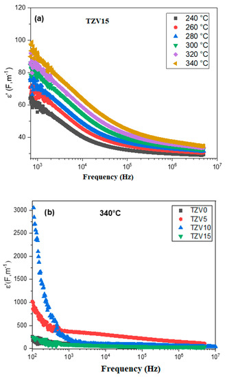 Figure 11a shows a decrease of the dielectric constant ε′ relative to TZV15 with the applied frequency while it increases with temperature. This is assigned to the electron hopping between two different sites [43]. The high values of ε′ in the range of low frequencies (Figure 11b) are related to charges accumulation at the interfaces between the electrodes and the glass, e.g., interfacial polarization [44]. The behavior of dielectric permittivity with frequency is related to the polarizability loss of some species since the hopping carriers are unable to follow the applied field [42], and their oscillations vanish with time. The relatively high values of ε′ relative to the TZV5 glass in the regions of low and medium frequencies make of it an appropriate material for optical devices [42].
