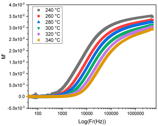 The very small value of M′ in the region of lower frequencies indicates the suppression of the electrode polarization and the absence of long-range conduction (see Figure 13). The continuous dispersion of M′ with increasing frequency and for all the temperatures informs that the conduction process is assured through short-range mobility of charge carriers in all the glasses. This process is related to the weak restoring force in the glasses that governs the mobility of charge carriers under the influence of the applied electric field [39].