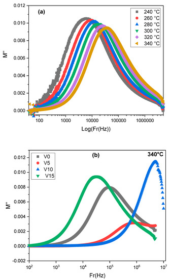 Figure 14b displays the M″ curves versus frequency, at T = 340 °C, for all the V2O5 compositions. The peak position is very sensitive to the V2O5 content. The band relative to x = 10 mol % is importantly shifted to the high-frequencies range. This is related to the polarization effects of mobile ions hopping, which suggests that the relaxation time of this glass sample is lowest compared to the other glass samples. Moreover, the curve of M″(ω) confirms a large relaxation peak for the distribution, which informs again about a non-Debye model for the studied glasses.