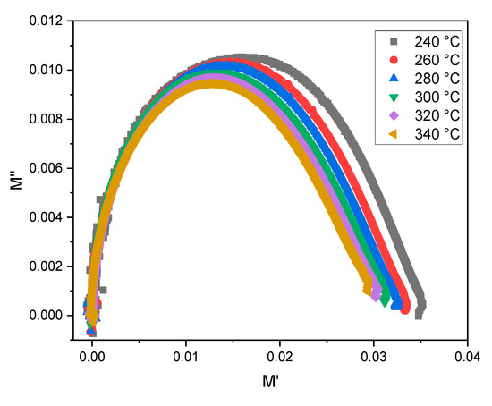 The imaginary part M″ represents a maximum peak M″max within the frequency (see Figure 14a). In the frequency region below the M″ peak, the polarons drift to long distances, whereas, for the frequency range above the peak, the polarons are confined to potential wells where they are free to move. Therefore, the peak frequency represents the transition from long- to short-range mobility [46]. The asymmetric curve of M″ and its variation within the frequency at each temperature suggested a spread of the relaxation times, which can be related to a process of coupling of the individual relaxation: one site needs to relax before the other can be done [8]. On the other hand, the shift towards higher frequencies of the relaxation peak with increasing temperature indicates the dependance of the relaxation process on temperature.
