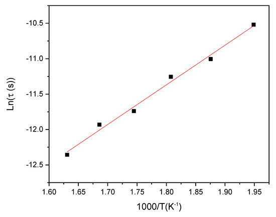 As shown in Figure 16, the plot of the relaxation time τ versus 1/T suggests the activation law [42]: