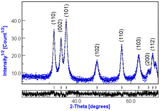 The analysis of XRD data was performed using the MAUD software (Material Analysis Using Diffraction, http://www.ing.unitn.it/~maud/ accessed on 10 May 2022). It is a general diffraction/reflectivity analysis program mainly based on the Rietveld method. The best fit was obtained in an isotropic model simulating planar defects with nanocrystal sizes of 21.9 ± 0.2 nm and a phase composition of 100% ZnO.