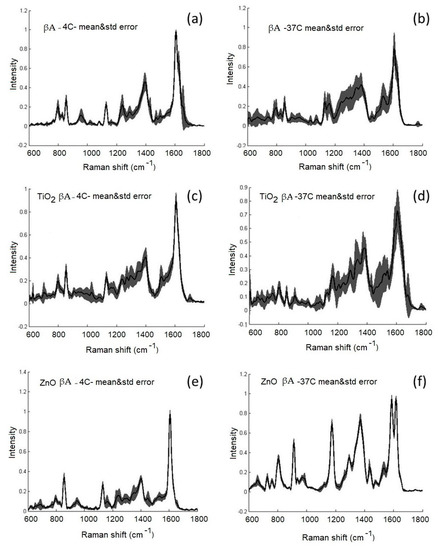 Averaged SERS spectra (n = 8–21) of suspensions of: (a,b) βA solution (10 nM); (c,d) TiO2-NPs coated with βA; (e,f) ZnO-NPs coated with βA, at 4 °C and 37 °C with standard errors.