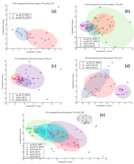 PCA analysis of SERS spectra (n = 8–21) of βA 1-40 solution (10 nM), TiO2-βA NP, ZnO-βA NP suspensions (0.5 mg NPs/mL): (a) Effect of 37 °C on βA structure; (b) effect of NPs and 37 °C on βA structure; (c) effect of NPs on βA structure (4 °C); (d) effect of NPs on βA structure (37 °C); (e) total temperature and NP effects on βA structure.