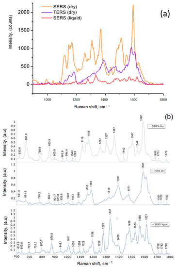 Single recorded TiO2-α-Syn NP SERS (in suspension and dry sample) and TERS spectra, as well as normalized spectra after background correction are shown in Figure 8. For a more detailed analysis, correction and normalization of all registered spectra (12–20) and a comparative analysis of average spectra were performed. TERS spectra should theoretically be more uniform as compared with SERS spectra, which may depend on the heterogeneity of the nanostructured surface, but from the initial data, we can assume that TERS spectra are also quite heterogeneous. This may be related to the heterostructural coating of the TERS probe with silver crystals.