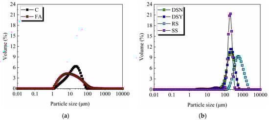 Particle size distributions of raw materials. (a) Powder material. (b) Different fine aggregates.