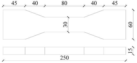 The compression test was carried out on three cube-shaped specimens each with a dimension of 70.7 × 70.7 × 70.7 mm3 according to JGJ/T 70-2009 []. The uniaxial tension test was carried out on three dog bone-shape specimens, and their dimensions are shown in Figure 2. By referring to JC/T 2461-2018 [], tensile deformation was measured using an extensometer with a loading rate of 0.5 mm·min–1. After the tensile test was completed, the average crack spacing and average crack width were obtained, while the number of cracks was calculated.