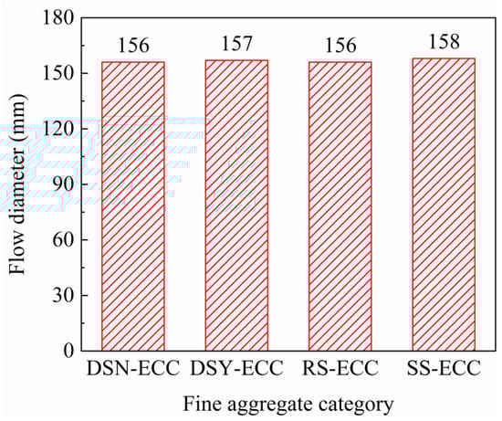 The working performance of ECC was measured by testing the maximum flow diameter of fresh mortars. Figure 3 illustrates that the flow diameter of the ECC mortars prepared from different fine aggregates is between 156 and 158 mm, and the flowability of the four mixtures is not much different. According to the literature [], the influence of aggregates on the working properties of materials is mainly determined by their particle size distribution and structural characteristics. The better roundness of desert sand particles helps to reduce the friction between particles and improve the workability. However, Figure 1b presents that the particles in desert sand are finer compared to river sand, which can lead to a larger specific surface area and increased water demand. Therefore, the flowability of desert sand-based ECC is comparable with that of ECC prepared from river sand or standard sand under the mutual influence.