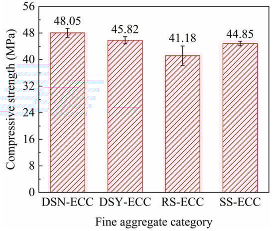 Figure 4 summarizes the compressive strength of ECC corresponding to different aggregates. Figure 4 illustrates that the order of compressive strength of ECC is: DSN-ECC > DSY-ECC > SS-ECC > RS-ECC, and the strength of DSN-ECC could reach 1.16 times that of RS-ECC. The results indicate that the ultra-fine particles with a particle size of less than 175 μm in desert sand exhibited heterogeneous nucleation and pozzolan effects. Particle size led to the reduction in the distance between nucleation sites and cement particles, promoted the hydration reaction of cement, and resulted in the generation of more hydration products, which not only optimized the matrix structure, but also enhanced the compressive strength of the matrix [,]. Furthermore, smaller desert sand particles and thinner slurry thickness can improve the structure and strength of the interfacial transition zone by inhibiting ion migration in the interfacial transition zone []. Moreover, the CaO/SiO2 ratio (calculated from Table 1: 0.166) is larger for desert sand compared to that for river sand and standard sand, which also exhibits a positive effect on the development of compressive strength [].