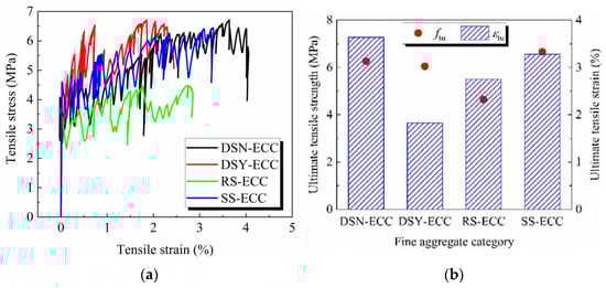 Figure 5a intuitively shows that the ECC prepared from different fine aggregates show good ductility, and the stress continues to increase with the increase of strain until failure. Among them, DSN-ECC exhibits the best overall tensile performance, and RS-ECC shows the worst tensile performance.