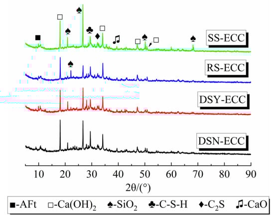 The composition of the matrix phases of the four ECC is shown in Figure 7. The figures show that the main phases in the four types of ECCs are AFt, Ca(OH)2, silica (SiO2), C–S–H gel, and calcium oxide (CaO), and a small amount of dicalcium silicate (C2S). Moreover, AFt, Ca(OH)2, and C–S–H gel are the main hydration products of ECC. Compared with the other three sands, the peak intensities of C–S–H gels (29.4°) in the XRD spectrum of DSN-ECC are the largest, which indicates that more C–S–H gels are produced in desert sand-based ECC. This may be attributed to the volcanic ash effect of some active fines in the desert sand, which promotes the cement hydration []. In turn, the matrix structure was optimized, which led to an effective improvement of all aspects of DSN-ECC performance. In contrast, DSY-ECC produced less C–S–H gel than DSN-ECC, probably because some active desert sand particles were washed away during the washing process. This attenuated the hydration process of DSY-ECC and resulted in poorer mechanical properties.
