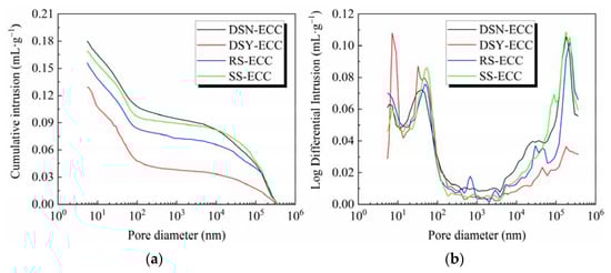 Based on the principle of fractal theory, when the fractal dimension D value is equal to 2, it indicates that the object under test is a smooth plane, while D values close to 3 imply that the morphology and spatial distribution of the pores are very complex [,]. Therefore, D values between 2 and 3 [,,] for the pore structure are meaningful. Table 7 presents that the D values of all ECC specimens vary between 2.8 and 2.9, which indicates the pore structure of ECC prepared with different fine aggregates shows a clear fractal character. Meanwhile, the fractal dimension provides a good characterization of the pore structure of ECCs with different fine aggregates. Table 7 presents that for ECC prepared with different aggregates, the D values are as follows: DSY-ECC > RS-ECC > DSN-ECC > SS-ECC and the DSY-ECC has the most complex pore structure. The above results indicate that the complexity of the pore structure of ECC prepared from different fine aggregates is different, which may be related to the particle sizes and chemical composition of different fine aggregates.