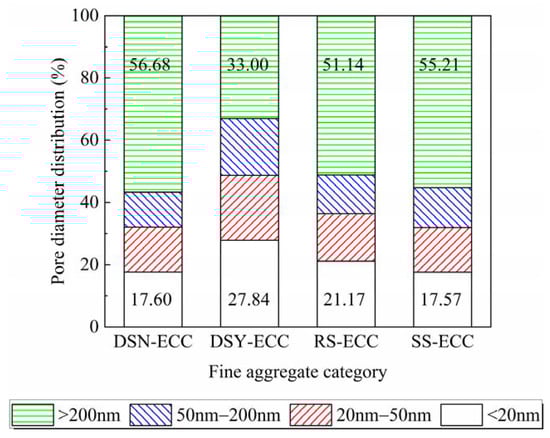 Figure 9 presents a comparison chart of the content of different pore sizes in the total pore size of different fine aggregates. According to the pore size, the pores can be divided into harmless (<20 nm), less harmful (20–50 nm), harmful (50—200 nm), and multi-harmful (>200 nm) []. The figure illustrates that DSN-ECC and SS-ECC have low harmless pore content and DSN-ECC shows high harmless pore content. However, DSN-ECC and SS-ECC exhibit superior tensile strain resistance. It indicates that the more the content of harmless pores in ECC, the detrimental they are to the development of tensile strain resistance of the specimens.