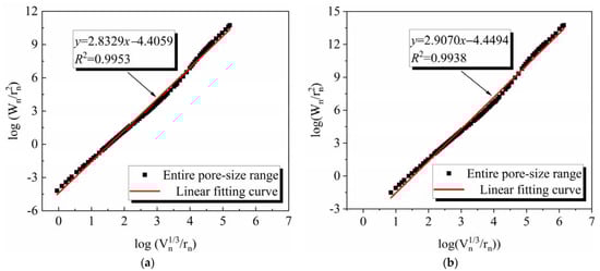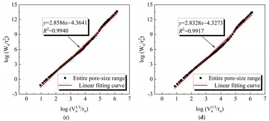 where is the average pressure of the ith mercury feeding operation, Pa, is the amount of mercury fed in the ith feeding operation, m3, n is the number of intervals applied in the mercury feeding operation, dn is the pore diameter corresponding to the nth mercury feeding, m, Vn is the cumulative amount of mercury fed in pressure intervals 1 to n, m3; C is a constant; Wn is the accumulated surface energy in the mercury intrusion process up to the nth stage, Qn is the function of pore radius rn and pore volume Vn at the nth stage of mercury intrusion process, and D is the fractal dimension calculated based on thermodynamic relations. The corresponding groups of and Qn were obtained from the experimental mercury compression data, and then the logarithm of these two was plotted for linear regression. The slope of the obtained curve was the fractal dimension D.