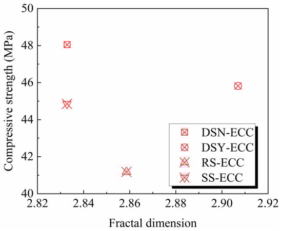 Figure 11 shows the relationship between the fractal dimension and compressive strength of ECC. The figure illustrates the absence of any strong correlation between the compressive strength of ECC and the fractal dimension, which is consistent with the research results presented in a literature study [], but different from the research results of other related studies [,,], which may be related to the composite characteristics of ECC itself. It is not difficult to find that the water-washed desert sand leads to a more complex pore structure and also a decrease in compressive strength compared to DSN-ECC, which indicates that the water-washing process is detrimental to the development of mechanical properties of desert sand-based ECC.