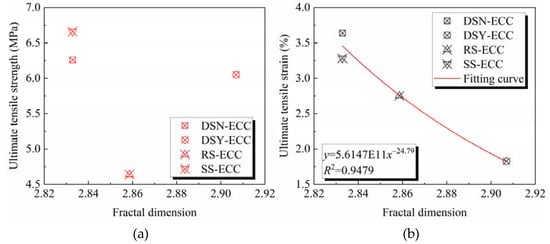 Figure 12 show the relationship between the fractal dimension and the tensile properties of ECC. Figure 12a demonstrates that the fractal dimension of ECC with different aggregates is weakly correlated with the ultimate tensile strength, which is consistent with the findings on compressive strength. Compared to desert sand and standard sand, river sand shows a large particle size (see Table 1), and this may affect issues such as fiber dispersion and pore structure in ECC, resulting in large differences in mechanical properties. However, comparative analysis of the desert sand-based ECC and standard sand-based ECC with similar particle size indicates that the fractal dimension is negatively correlated with the compressive strength and tensile strength. That is, the larger the fractal dimension, the more unfavorable it is to the strength development. Figure 11 illustrates that with the increase of the fractal dimension, the ultimate tensile strain gradually decreases. Fitting of the relationship shows that the fractal dimension of ECC has a power function relationship with the ultimate tensile strain, and R2 is 0.9479, which is in good agreement. It indicates that the fractal dimension can be used to characterize and calculate the ultimate tensile strain of ECC.