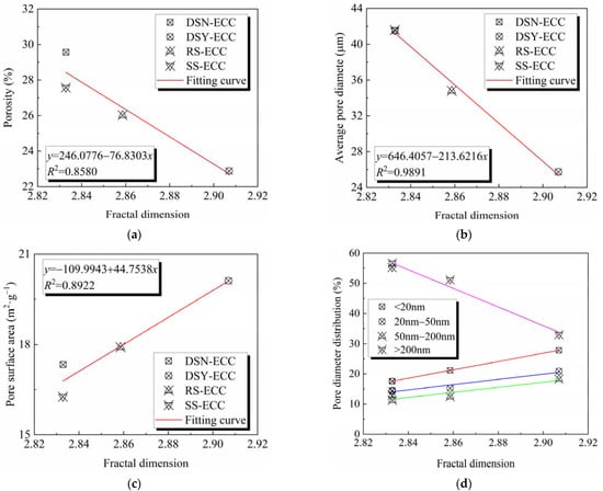 Figure 13a,b exhibit that with the increase in the fractal dimension, the porosity and average pore size gradually decrease, and this is different from the results presented in the literature report [], which may be the effect of the existence of aggregate category. The fitting of the results shows that the fractal dimension exhibits a linear relationship with the pore surface area and the average pore diameter, and R2 is 0.8580 and 0.9891, respectively, which is within the acceptable range. Figure 13c shows that with the increase in the fractal dimension, the pore surface area gradually increases, which is consistent with the results reported in the literature []. The fitting results show that the fractal dimension is linearly related to the pore surface area, and R2 is 0.8922, which is within the acceptable range. Figure 13d and Table 8 present that with the increase in the fractal dimension, the pore size content changes inconsistently, among which the pore size content in the range of <20 nm, 20–50 nm, and 50–200 nm gradually increases with the increase of fractal dimension; however, the pore size content of >200 nm gradually decreases. The relationships were fitted and found to be linear, and the agreement was good. Thus, clearly, the fractal dimension can be used to characterize and calculate the pore structure parameters of ECC.