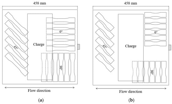 The tensile specimen geometry for the intermediate strain rate tests was a modified ASTM D638 Type V geometry (modified to allow a fastener to pass through the gripping regions both to pin the specimen and apply a clamping load through serrated surfaces of the grip). This geometry was utilized in previous studies of similar LFT materials at quasi-static strain rates [11,20]. The gauge length was also reduced from the 9.53 mm length in ASTM D638 to 5 mm to maximize the achievable strain rate. The specimen layout is shown in Figure 5a, note that material availability was limited for these intermediate strain rate tests and the available plaques did not permit every specimen shown to be extracted from each plaque. Multiple plaques were needed to extract the specimens for intermediate strain rate testing.