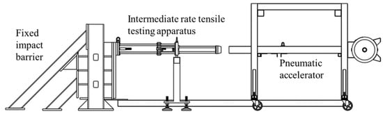 Intermediate strain rate tensile test apparatus integrated with fixed impact barrier and pneumatic accelerator.
