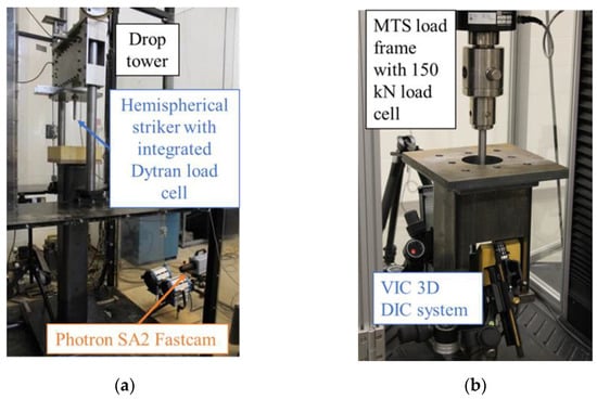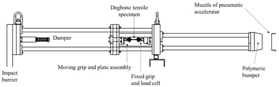 Intermediate strain rate (approximately 10 s−1 to 200 s−1) tensile tests were completed on a custom-designed and engineered apparatus shown in Figure 3 and Figure 4. A 101.6 mm by 101.6 mm hollow structural section (HSS) of steel tubing formed the barrel of the impactor and connected to a pressure vessel which was utilized to accelerate an 8 kg aluminum projectile. This set of components is identified as the pneumatic accelerator in Figure 3. The projectile passed over an aperture in the barrel near the muzzle to disrupt a signal obtained from a laser displacement transducer for triggering a high-speed camera and data acquisition from the load cell. The projectile impacted an assembly (Figure 4) with one unconstrained (translational) degree of freedom (through constraints imposed by seven ceramic linear bearings), connected to a 7000 series aluminum grip assembly which constrained one end of a tensile specimen. The other end of the specimen was held by an identical grip assembly connected to an IEPE load cell (PCB 224C) mounted to a fixed assembly ultimately supported by a large rigid barrier fastened to a concrete floor. The grip design went through multiple iterations to minimize mass (at approximately 50 g per grip, not including the fasteners). For the stiffer and higher strength 0-degree specimens, a small piece of vinyl rubber (approximately 10 mm by 10 mm by 10 mm) with an adhesive pre-applied on one side was attached to the surface of the apparatus impacted by the projectile to reduce vibration in the apparatus resulting from this impact.