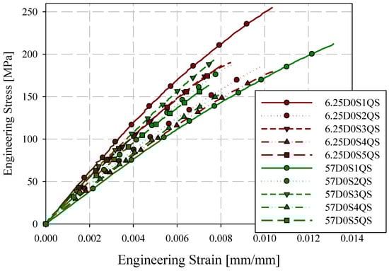 0-degree quasi-static engineering stress-strain responses ASTM D638 type III and reduced gauge length (6.25 mm) specimens.