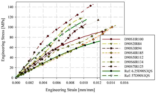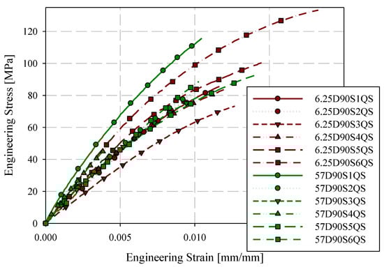 90-degree quasi-static engineering stress-strain responses ASTM D638 type III and reduced gauge length (6.25 mm) specimens.