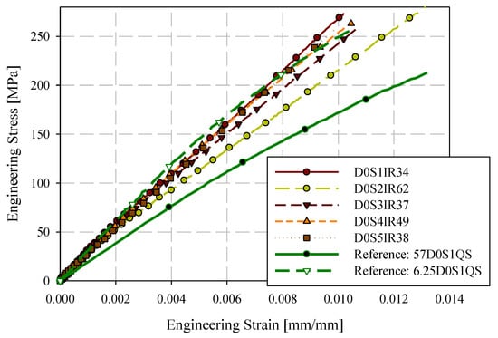 Uniaxial tension test stress-strain results from the intermediate strain rate tension testing apparatus, obtained for the 0-degree direction, are shown in Figure 9. Specimens were labelled with the format DXSYIRZ where X is the orientation of the specimen with respect to the flow direction (0° or 90°), Y is the specimen ID (generally starting at S1), IR indicates an intermediate strain rate (10 s−1 to 200 s−1), and Z is the strain rate (s−1). The intermediate strain rate results skew towards the upper limit observed for the quasi-static response, also presented in Figure 9. The stress-strain responses are significantly more linear than the complementary quasi-static results which may be indicative of minimal positive strain rate sensitivity. The stress-time (obtained from load-time with the initial specimen gauge cross-section) and strain-time (from DIC) were cross-plotted by fitting a small number of spline segments (approximately 3) to the strain-time data and increasing the time domain resolution to equal that of the load-time data. The load data was not manipulated in any way; no filters or smoothing were applied when post-processing the data.