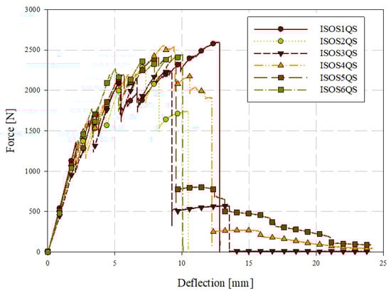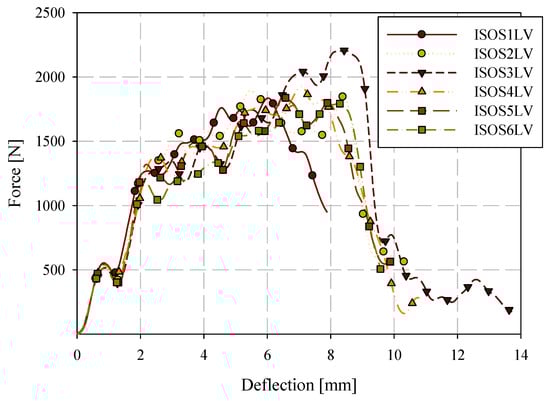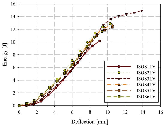 Low-velocity (LV) ISO 6603-2 puncture specimens were labelled with the format ISOSXLV where X is the specimen ID (starting at 1). Filtered force-deflection responses for low-velocity puncture testing, completed in accordance with the ISO 6603-2 standard, are shown in Figure 14 for all six specimens tested and a single force-deflection response is shown for specimen ISOS1LV in Figure 15 (both filtered and unfiltered). A 2-pole Butterworth filter with forward and reverse passes (resulting in a 4-pole filter) with a channel frequency class (CFC) of 1000 was applied. This is the highest frequency cut-off low-pass filter specification in SAE J211 [26]. Compared to the quasi-static results, the change in force associated with the initiation and propagation of fractures were not captured well in either the filtered or unfiltered responses. Energy-deflection responses are shown in Figure 16. In terms of energy-deflection, all six specimens show very similar responses with only some variation in the displacement to failure and the peak energy dissipated through the puncture testing.