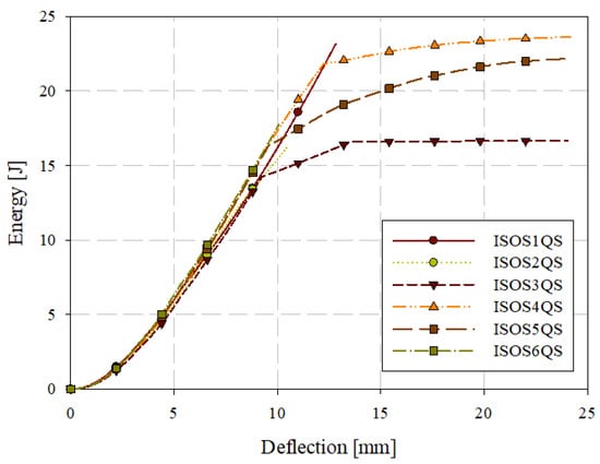 Quasi-static puncture testing was conducted consistent with ISO standard 6603-2, but with the velocity reduced to 0.22 mm/s or 0.005% of the ISO 6630 impact speed of 4.4 m/s. Specimens were labelled with the format ISOSXQS where X is the specimen ID (starting at 1). Force-deflection data from this series of tests are shown in Figure 11. Individual quasi-static and low-velocity impact force-deflection responses are presented in Section 3.5. This drastic reduction in loading rate allowed for the use of high-resolution cameras with the digital image correlation (DIC) system while acquiring high-resolution data in the deflection domain. Table 3 presents the consistency in general force-deflection responses in terms of initial stiffness and peak load and the corresponding deflection at peak load. Energy-deflection responses are shown in Figure 12. Force-deflection and energy-deflection responses are generally consistent for all six quasi-static specimens until the onset of catastrophic failure. Energy-deflection responses up to approximately 10 mm of deflection were very consistent. Force-deflection responses, even at deflections as low as approximately 2.5 mm, exhibit variation associated with the initiation and propagation of fracture.