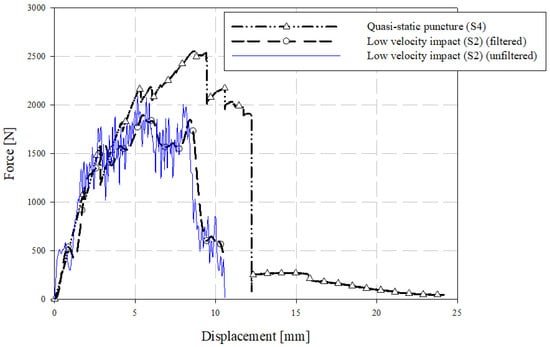 Filtered low-velocity impact puncture force-deflection responses.
