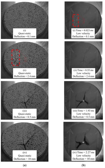 Images of specimen face opposite indenter: (a) quasi-static, (b) low-velocity impact.