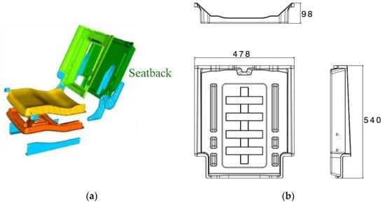 LFT-D Automotive Seatback: (a) as part of the assembly, (b) overall dimensions [mm].