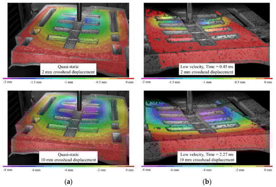(a) Quasi-static and (b) low velocity impact loading comparison for longitudinal charge seatbacks: z-deflection contours.