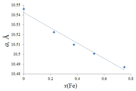 Samples of composition of Bi1.5Mg0.75−xFexTa1.5O7±Δ (x = 0, 0.225, 0.375, 0.525, 0.75), according to the results of X-ray phase analysis, crystallize in the cubic crystal system. An analysis of reflection extinctions made it possible to confirm that the symmetry of the crystal structure is indeed cubic with the space group :2. The structure of pyrochlore based on bismuth tantalate was refined by us earlier [17,18,19,20] and is used in this work to analyze the effect of iron atoms on the thermal expansion of samples. As a result of the calculation of the unit cell parameter of the samples, it was found that with an increase in the concentration of iron and a decrease in the content of magnesium, the cell constant decreases uniformly from 10.5225 ± 0.0007 (x = 0.225) down to 10.5009 ± 0.0001 Å (x = 0.525), obeying the Vegard law. This fact, firstly, indicates the formation of a continuous series of solid solutions and, secondly, the same type and uniform distribution of iron and magnesium ions in one system of crystallographic sites, for example, only in the tantalum(V) octahedral sites. The dependence of the unit cell parameter on the iron content is shown in Figure 1.