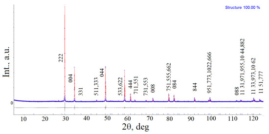 Based on powder XRD data, the crystal structure was refined for the composition Bi1.5Mg0.375Fe0.375Ta1.5O7−Δ using the Topas 5.0 software package [21]. Table 1 and Table 2 show the results of the refinement of the structure of pyrochlore by the Rietveld method in the space group Fd3 m:2 (227). The experimental, calculated, and difference diffraction patterns of Bi1.5Mg0.375Fe0.375Ta1.5O7−Δ are shown in Figure 3.