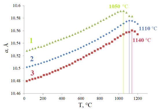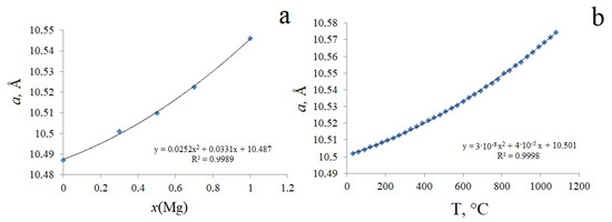 In addition, if magnesium(II) ions are distributed in the Ta(V) positions, then the number of oxygen vacancies, and, consequently, distortions of the coordination polyhedron, will be more significant compared to Fe(III). These factors adversely affect the thermal stability of pyrochlore. As a result, it can be stated that the thermal stability of pyrochlore will be the higher, the smaller the parameter of its unit cell. One can also note a noticeable similarity in the nature of the change in the cell parameter when a smaller Fe(III) cation is replaced by a larger Mg(II) and with an increase in temperature (Figure 6). The figure shows that both dependencies are well described by a quadratic function with a high value of the correlation coefficient. The similarity of the effect of temperature and substitution of a smaller cation for a larger one is described for different classes of compounds. In particular, the similarity of thermal, baric, and compositional deformations was first noted in [29,30,31] and later by many authors, including [32,33,34]. The fact is that the substitution of cations of a smaller radius for larger ions is associated with an increase in length and, at the same time, a decrease in the strength of the bond, and an increase in stresses in the structure. This, in turn, has a destabilizing effect on the structure, similar to temperature effects (heating). Therefore, magnesium-containing pyrochlores, if heated, dissociate at a lower temperature than iron-containing pyrochlores.