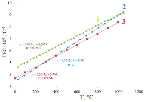 Temperature dependences of TECs of Bi1.5Mg0.75Ta1.5O7 (1), Bi1.5Mg0.375Fe0.375Ta1.5O7−Δ (2) and Bi1.5Fe0.75Ta1.5O7+Δ (3) pyrochlores.