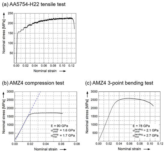 Representative curves showcasing the data from Table 1. (a) Tensile tests of AA5754-H22 according to the DIN EN ISO 6892-1 process A, (b) compression and (c) 3-point bending test of AMZ4.