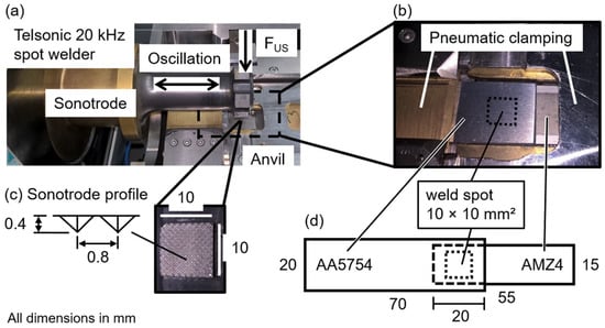 (a) The Telsonic spot welder, oscillating at 20 kHz, with custom-made anvil for positioning and clamping of AA5754 and AMZ4. (b) AA5754 and AMZ4 clamped separately before welding; the dotted square indicates the position of the weld spot. (c) Details of the square 10 × 10 mm2 sonotrode profile with pyramids of 0.4 mm height and 0.8 mm distance from each other. (d) Geometry of the overlapping specimens with AA5754 on the tool side.