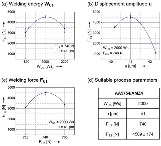(a) Influence of the welding energy WUS on the tensile shear force FTS, welding force and displacement amplitude are kept constant. (b) Influence of the displacement amplitude u on the tensile shear force FTS, welding energy and welding force are kept constant. (c) Influence of the welding force FUS on the tensile shear force FTS, welding energy and displacement amplitude are kept constant. Each diagram is based on nine trials. (d) Suitable process parameters for AA5754/AMZ4 joints with the highest tensile shear forces and the best reproducibility.