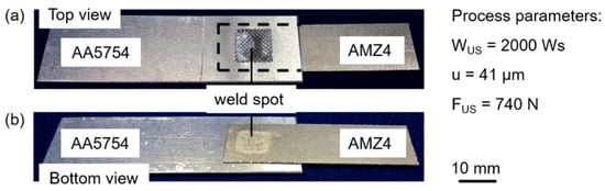 The combination of the relatively soft AA5754 and the around 10 times stronger AMZ4 requires a high amount of energy to enable plastic deformation at the interface [,]. In addition, process parameters with large values of the displacement amplitude and small ones of the welding force result in large plastic strains in the welding zone and enhance joint formation []. A displacement amplitude lower than 38 µm and a welding force lower than 700 N does not result in bonded materials. Higher displacement amplitudes than 41 µm usually cause deep imprints of the sonotrode surface pattern on the low-hardness aluminum sheets. These deep indentations often lead to cracks in the Al sheet at the edges and are sometimes seen to grow into the adjacent material as well. These cracks are observed to fail prematurely during tensile testing, resulting in a significant increase in the scatter of the tensile shear strength. Thus, as a result of our study, the applicable ranges for each parameter are found to be significantly narrowed. Starting from the parameter combination with the highest tensile forces, each of the three main parameters is varied individually. Figure 3 shows the results of this approach. Each diagram contains the influence on the tensile shear force FTS of the variation of one parameter while the others are kept constant. Furthermore, the curves depict the results of a second order polynomial fit in the software Origin (OriginLab, Northampton, MA, USA) to highlight the effects of changing the process parameters. The welding energy WUS in Figure 3a reveals the highest tensile shear forces at 2000 Ws with the best reproducibility, compared to the results at 1800 and 2200 Ws, respectively. A welding energy lower than 1800 Ws is not sufficient to achieve an adequate joint between AA5754 and AMZ4. In contrast, 2200 Ws leads to over-welding, in that connections are destroyed again by the sustained oscillations. A displacement amplitude u of 42.3 µm results in cracks in the aluminum sheet and consequently in a massive scatter of the tensile shear forces (Figure 3b). Insufficient values for the displacement amplitude as well as for the welding force FUS (Figure 3c) do not lead to adequate plastic deformations at the interface of the joining partners. In contrast, a welding force of 760 N causes sticking of the surfaces and restricts the relative motion, resulting in lower tensile forces than at the optimum welding force. With the general conditions regarding materials, geometries and the entire setup, only a very limited process window is available. The parameters are interdependent and in a suitable combination; only one specific value is found to be appropriate per parameter. Suitable process parameters for the AA5754/AMZ4 joints with the highest tensile shear forces of FTS = 4509 ± 174 N are the welding energy WUS = 2000 Ws, the displacement amplitude u = 41 µm and the welding force FUS = 740 N. All further experiments use these parameters as the benchmark. Figure 4 shows images of successfully welded samples. The typical imprint of the sonotrode surface with the pyramidal profile marks the weld spot on the aluminum sheet (Figure 4a), while a slight discoloration is visible on the lower surface of the AMZ4 (Figure 4b), but no mechanical traces.