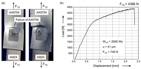 (a) Tensile shear tested AA5754/AMZ4 joints revealing the failure of the AA5754 sheet parallel to the edge of the weld spot. Process parameters: welding energy WUS = 2000 Ws, displacement amplitude u = 41 µm and welding force FUS = 740 N. (b) Characteristic load–displacement diagram of a tensile shear test of an AA5754/AMZ4 joint. Both elastic strain and plastic deformation occur, revealing the PLC effect that is typical for these aluminum alloys.