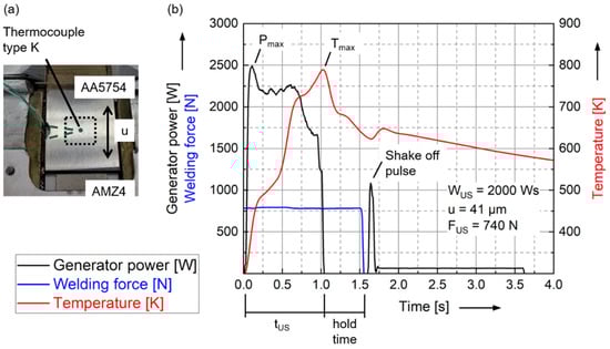 (a) Schematic illustration of the position of the thermocouple for temperature measurement at the interface in the center of the weld spot. (b) Characteristic curves of generator power, welding force and temperature measured with the thermocouple over time for AA5754/AMZ4 joints. The maximum temperature Tmax at the weld spot of 807 ± 25 K is reached at the end of the welding time tUS of 0.96 ± 0.06 s.