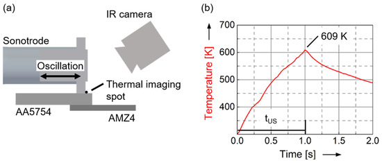 The presence of a thermocouple at the interface can adversely affect the results, as it implies a change in the process conditions. It could have an influence on the temperature development during the welding process. In particular, verification of the temperature profile is essential, since values are reached for a short time, which could lead to crystallization of the AMZ4. Therefore, some experiments are performed with infrared imaging and normal conditions at the interface. Thermal data is collected in the direction of the oscillation, and the center spot is evaluated in the gap between the tool and the aluminum sheet, shown in Figure 7a. The results show a qualitatively comparable curve with a peak temperature of 609 K (Figure 7b). Due to the measurement at the sheet surface, the temperatures are approx. 200 K lower than at the interface.