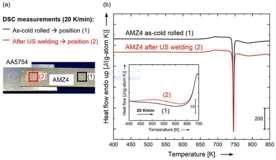 Differential scanning calorimetry study of AMZ4 before and after ultrasonic welding. (a) Photograph of the welded sample showing the positions from which the samples for the calorimetry are cut, where (1) indicates AMZ4 material far away from the joint, which represents AMZ4 in the as-rolled state, and (2) the AMZ4 part subjected to ultrasonic (US) welding. (b) Subtracted heat flow scans for the as-rolled AMZ4 (1) and AMZ4 after US welding (2). ΔHx is the heat of crystallization associated with the area of the first exothermic peak, which is obtained by integrating the peak. The inset shows the magnified heat flow signals in the low-temperature regime just before the sharp increase at the glass transition. The welded sample shows a smaller (less negative) heat release due to relaxation than the as-rolled sample, because it already encountered some degree of relaxation during the welding process.