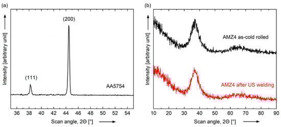 Further investigations on the influence of the welding process on the amorphous state of AMZ4 are carried out by X-ray diffraction analysis (XRD). Figure 10b shows the comparison of two surface scans of AMZ4 in as-cold rolled condition and AMZ4 after ultrasonic (US) welding. Both curves contain broad disperse peaks in contrast to the distinct sharp peaks of crystalline AA5754 in Figure 10a, which correspond to the (111) and (200) planes. All measurements are based on the same settings. The scan of AMZ4 after US welding is performed on the fractured surface of the weld spot after removing the aluminum sheet. Since this is the interfacial area between the amorphous and crystalline metals, the highest process temperatures are expected there. Both scans of AMZ4 in as-cold rolled condition and AMZ4 after (US) welding show a broad diffraction peak in the range of 25–40°, which is typical for an amorphous structure [] and has been demonstrated in previous studies of AMZ4 []. Since both curves are qualitatively the same and no sharp diffraction peaks appear, the measurements indicate that AMZ4 is still in the amorphous state after welding [,].